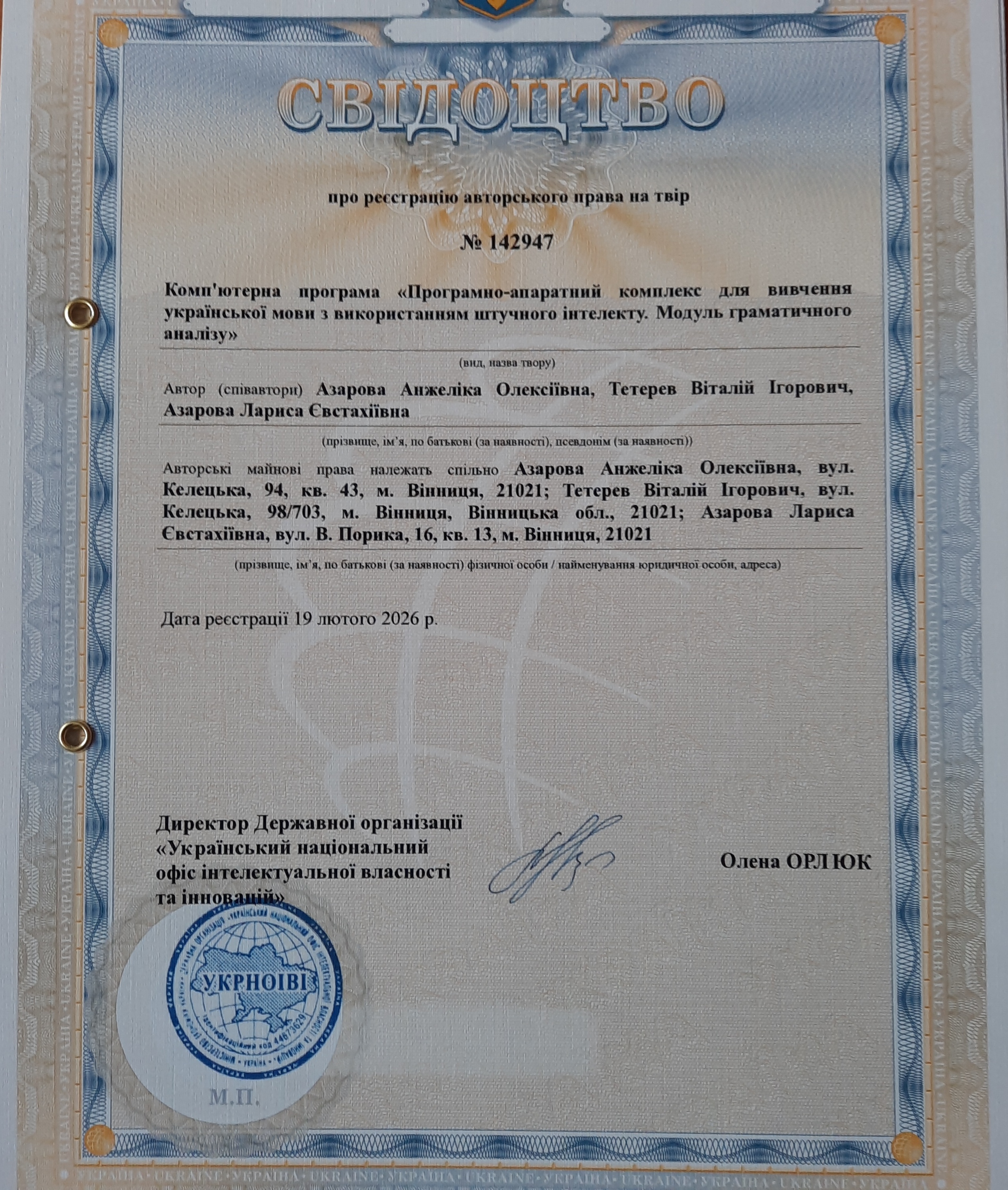 Комп`ютерна програма «Програмно-апаратний комплекс для вивчення української мови з використанням штучного інтелекту. Модуль граматичного аналізу»